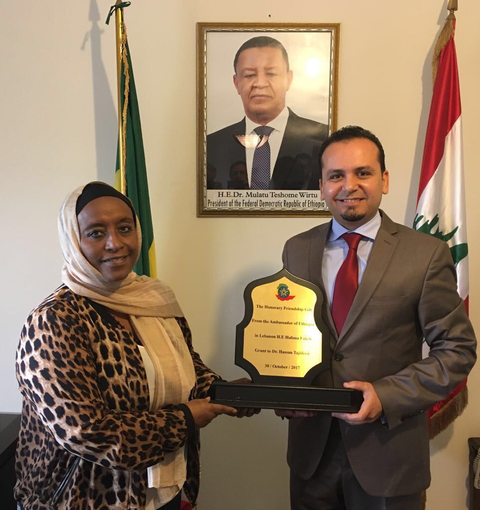 منحت جمهورية اثيوبيا الفيديرالية الديموقراطية بشخص السفيرة الاثيوبية حليمة محمد فيكي، وسام الصداقة والوشاح الاثيوبي لرئيس التكتل الاقتصادي اللبناني الدكتور حسن تاج الدين، “تقديرا لدوره الكبير في توطيد العلاقات الاقتصادية بين لبنان وإثيوبيا”، وذلك خلال حفل اقيم في مقر السفارة في الحازمية، حيث قلدت السفيرة حليمة, تاج الدين الوسام في حضور اعضاء السفارة واعضاء التكتل. وشكر تاج الدين اثيوبيا والسفيرة على منحه الوسام، وقال: “شرف لي ولوطني لبنان ان أضع هذا الوسام على صدري لانه ثمرة تعاون وصداقة بين الشعبين اللبناني والاثيوبي”.