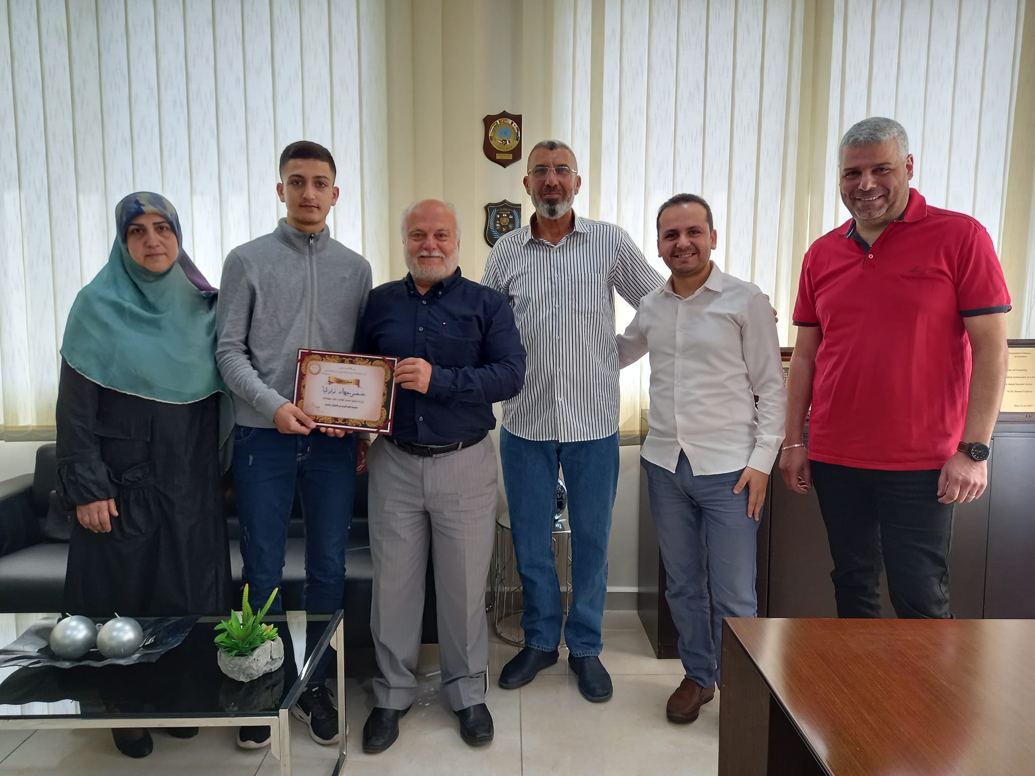 الدكتور حسن تاج الدين مكرمًا حافظ القرآن الطالب خضر زلزلي
