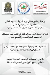 عقد لقاء تشاوري حول “التحديات الأمنيّة والاقتصاديّة لانطلاق العام الدراسي المقبل في القطاعين العام والخاصّ”، اليوم، في ثانوية صور الرسمية المختلطة، بدعوةٍ من الشبكة المدرسية الوطنية في قضاء صور، في حضور وزير التّربية والتّعليم العالي في حكومة تصريف الاعمال القاضي الدّكتور عباس الحلبي، رئيس لجنة التّربية النّيابيّة حسن مراد، عضوي اللّجنة النّائب علي خريس والنّائب الدّكتور أشرف بيضون، النّائب الدّكتورة عناية عزّ الدّين، النّائبة السابقة بهيّة الحريري ممثّلةً بأمين عام نقابة المدارس الخاصة الدّكتور أسامة أرناؤوط، السيدة رباب الصدر ممثلة بالسيدة ضحى كوراني، المسؤول التنظيمي لحركة “أمل” في إقليم جبل عامل المهندس علي إسماعيل والمسؤول التربوي المركزي في الحركة الدكتور علي مشيك والمسؤول التربوي في الإقليم الدكتور حسين عواركة، رئيس ثانويات ستارز كولدج الدكتور حسن تاج الدين.