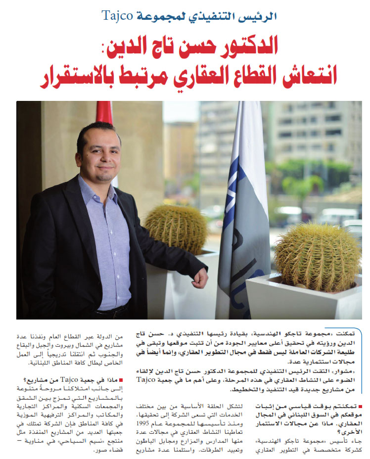 تمكنت “مجموعة تاجكو” بقيادة رئيسها التنفيذي د.حسن تاج الدين و رؤيته في تحقيق أعلى معايير الجودة من أن تثبت موقعها و تبقى في طليعة الشركات العاملة ليس فقط في مجال التطوير العقاري, و إنما أيضاً في مجالات إستثمارية عدة.