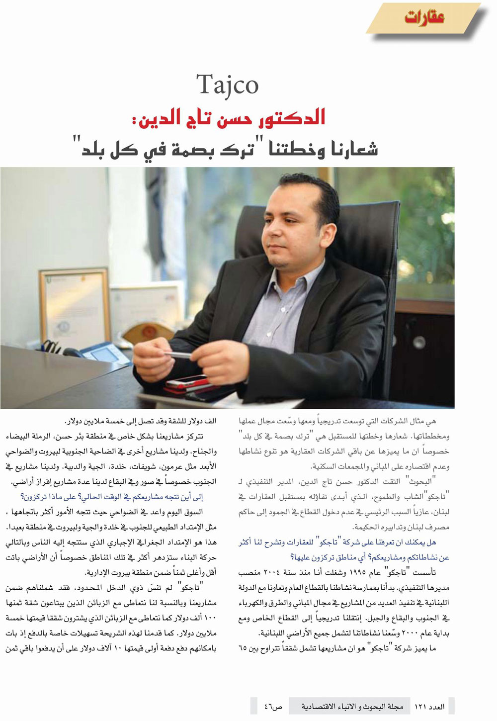 “البحوث” التقت الدكتورحسن تاج الدين, المدير التنفيذي ل”تاجكو” الشاب والطموح, الذي ابدى تفاؤله بمستقبل العقارات في لبنان,عازيا”السبب الرئيسي في عدم دخول القطاع في الجمود الى حاكم مصرف لبنان وتدابيره الحكيمة.