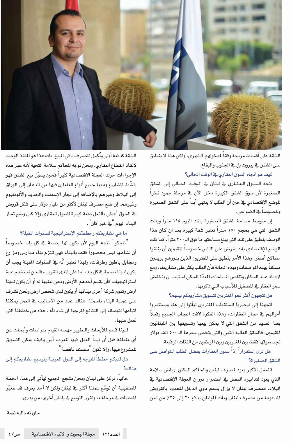 إنّ متوسط مساحة الشقق الصغيرة باتت اليوم 115 مترا” وباتت الشقق التي هي بحجم 150 مترا” تعتبر شقة كبيرة بعد أن كان هذا الوصف ينطبق على تلك التي يبلغ مساحتها ما فوق ال 200 مترا”. كما قلت الوضع الاقتصادي بات يفرض على الناس خصوصا” المقيمين ان ينتقوا مساكن اصغر. وهذا الامر ينطبق على المغتربين الذين بدورهم يريدون مسكنا” بهذه المواصفات وبهذه الحالة فان الطلب يكثر على مشاريعنا , ومع ازدياد عدد السكان وتقلص المساحات المعدّة للسكن أستبعد أن ينخفض سعر العقار في المستقبل للأسباب التي ذكرتها.