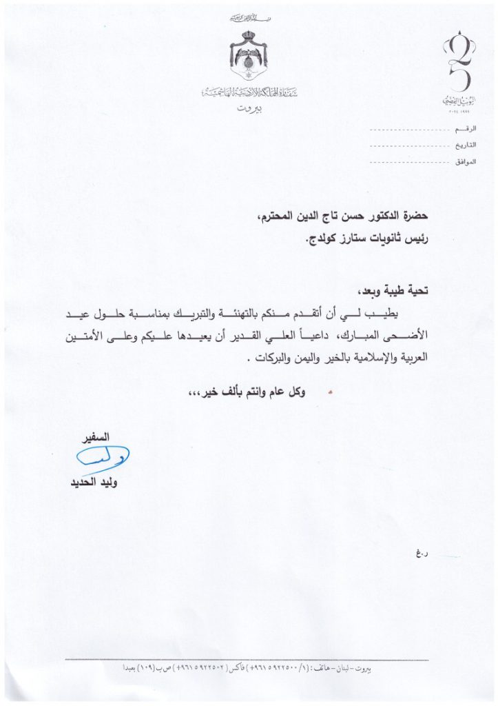 A congratulatory telegram to Dr. Hassan Taj al-Din on the occasion of the Blessed Eid from the Embassy of the Hashemite Kingdom of Jordan